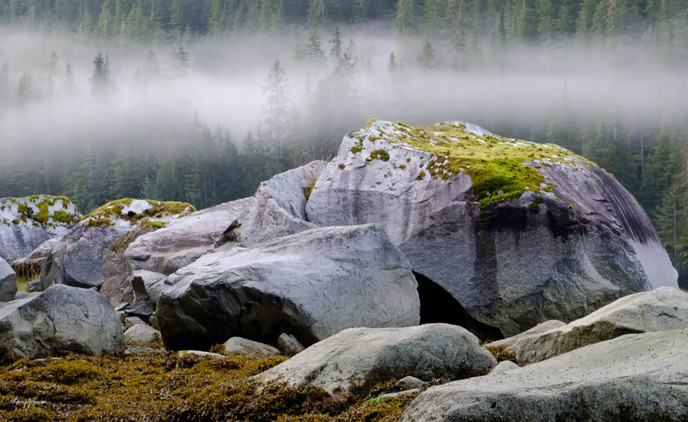 Four hours of hard bush-whacking bring me through some of the strangest rainforest I have ever seen, featuring a forest of glacial erratics (boulders) the size of houses. A thick layer of moss covers everything, and stretches between boulders like snow over an ice field. I find myself poking the moss in front of me searching for hidden crevasses. If I were to slip into one, I might never be found. There are obvious bear dens scattered among the boulders, like some sort of a high rent condo association for bears. I push on.